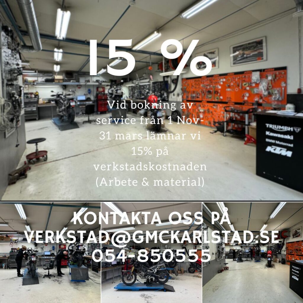 Fram till 31 mars lämnar vi 15% på verkstadskostnaden. Vi är auktoriserade för KTM, Husqvarna, Triumph & Kawasaki Men vi har även möjlighet att serva de flesta andra märken samt även service av fjädring. Kontakta oss för att boka verkstad@gmckarlstad.se 054-850 555